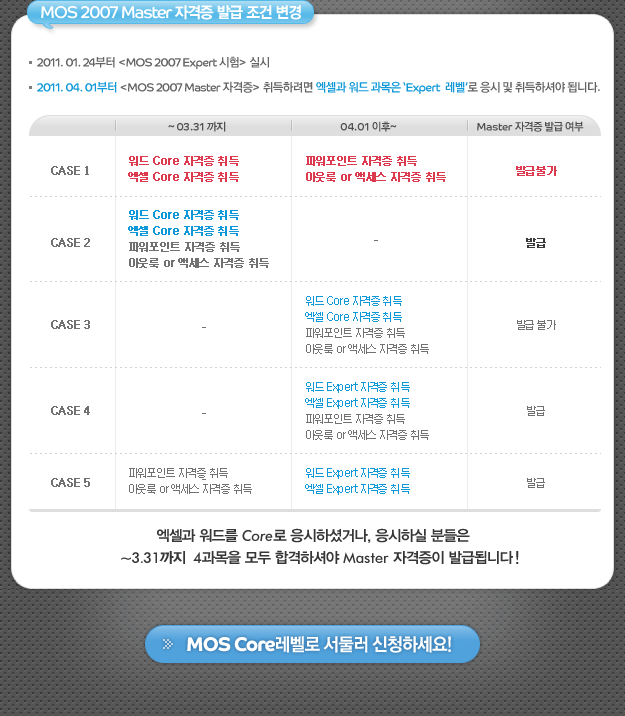 즉... 3월 31일까지는 가능하다고 보시면 됩니다. 4월부터는 Expert(Core보다 높은레벨)레벨로 워드와 엑셀을 취득하셔야 합니다.